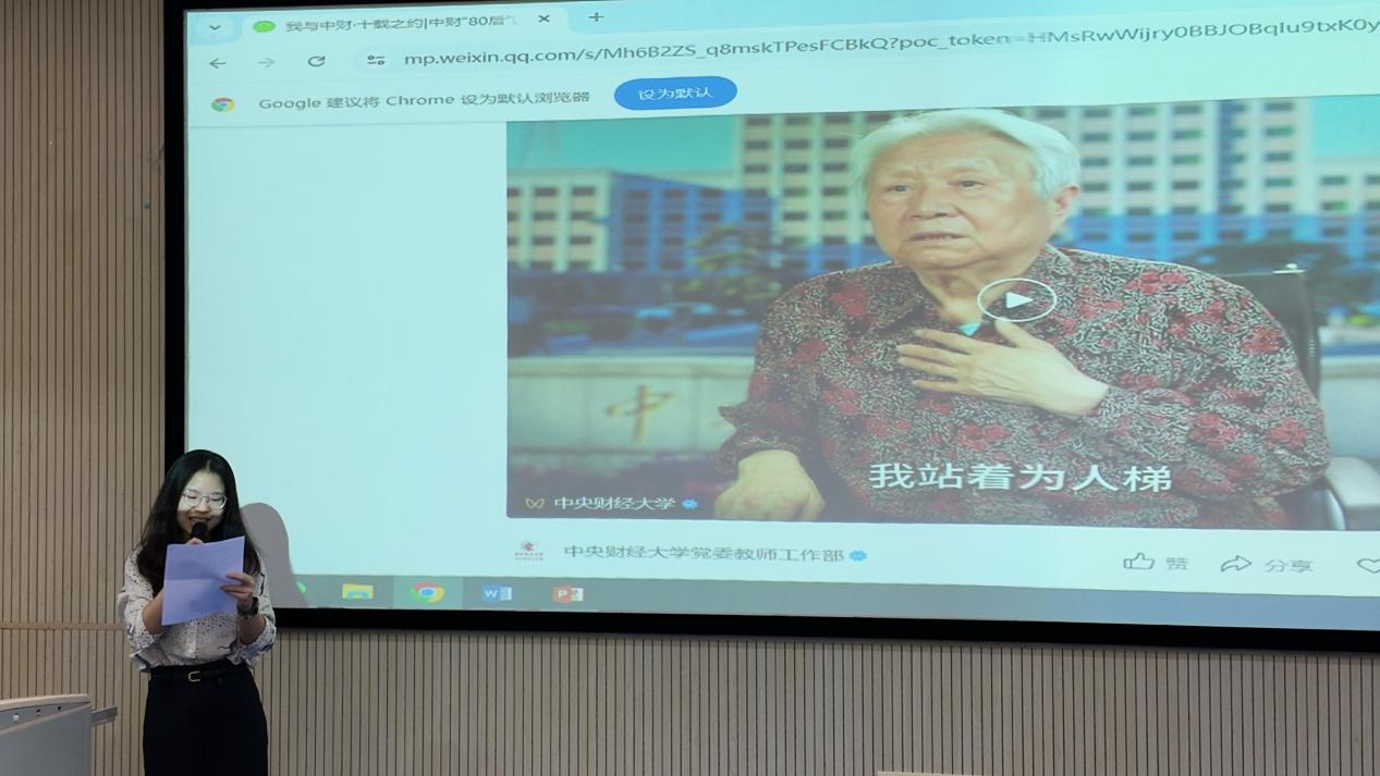顾雷雷副院长介绍了王老师的优秀事迹:王巾英教授是中央财政金融学院(现pg电子官方网站)二级教授、博士生导师,我国著名市场营销与涉外经济管理专家、财经教育家,市场学本土化拓荒者。她的多部著作获评优秀教材,填补了中国高校市场学教材的空白,创建了国内市场学课程体系。她以“为人梯、为人桥、为人路”的师者担当,照亮无数学子的成长之路。