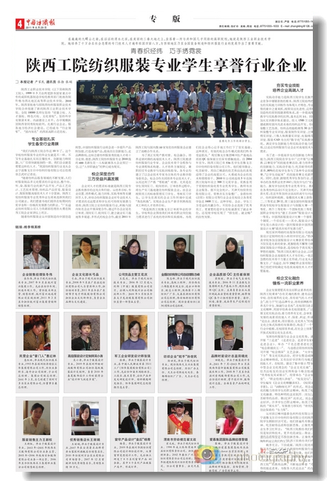 6月29日,《中国纺织报》记者严家民(通讯员张勃、张娟)以《青春织经纬,巧手绣霓裳——陕西工院纺织服装专业学生享誉行业企业》为题,专版报道我院为纺织服装行业培养技术中坚、管理精英、创业先锋的办学实践。