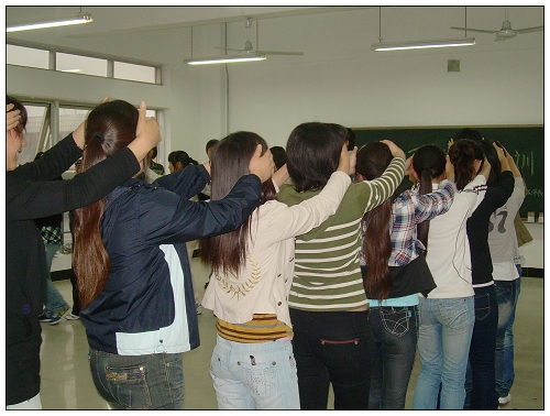 团体训练以协调人际关系、促进人际和谐、增强团体凝聚力、提升个人自信心为主要训练内容,通过“你我他”、“用手传真心”、“信任后倒”、“优点轰炸”、“心有芊芊结”等游戏方式使同学们不断探索和了解自我,认识自身潜能,增强自信心,增进彼此间的交流和沟通。(学生处 柳林供稿)