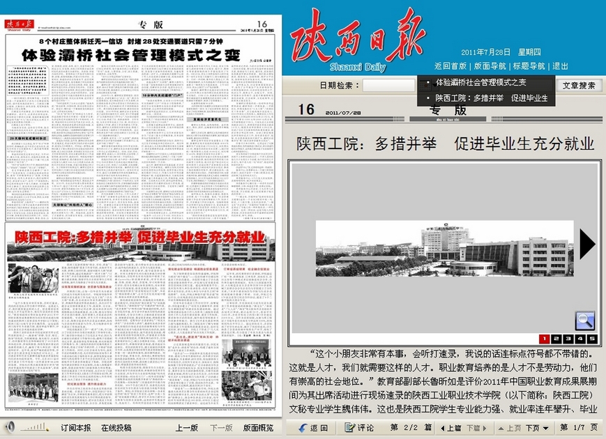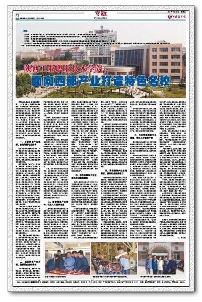7月29日,《中国教育报》第四版以《陕西工业职业技术学院:面向西部产业打造特色名校》为题专版报道我院办学成果,分别从建设具有西部产业特征的特色专业、创新校企合作体制、优化人才培养方案、强化实训基地建设、提...