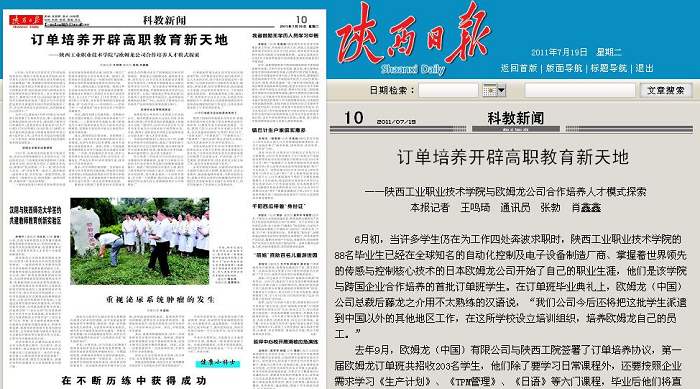 7月19日,《陕西日报》在第10版以《订单培养开辟高职教育新天地——陕西工业职业技术学院与欧姆龙公司合作培养人才模式探索》为题报道我院校企合作、订单培养的办学实践,先后被《中国教育新闻网》、《当代陕西网》等...