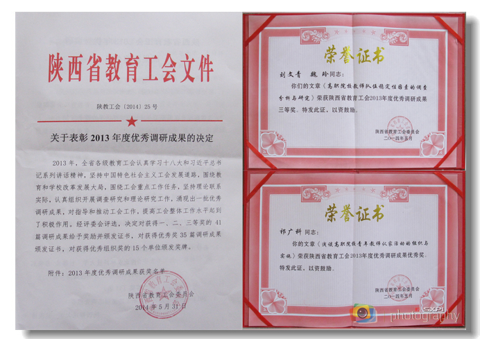 在刚刚结束的陕西省教育工会工运理论年会上,我院工会主席刘文青和图书馆魏玲联合调研、撰写的《高职院校教师队伍稳定性因素的调查分析与研究》荣获省教育工会2013年度优秀理论调研成果三等奖;工会祁广科撰写的论文...