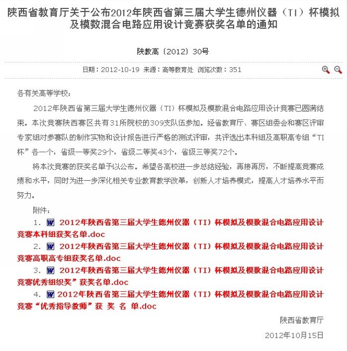 近日,2012年陕西省第三届大学生德州仪器(TI)杯模拟及模数混合电路应用设计竞赛结果揭晓,我院唐有勤、马阳阳、朱娟妮组成的代表队(指导老师吉武庆)获得省级一等奖;杨毅、罗京、赵娜娜组成的代表队(指导老师吴...